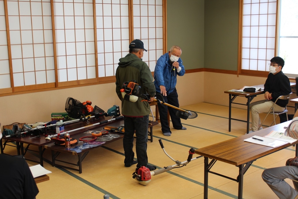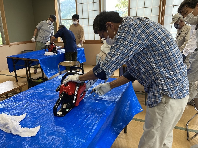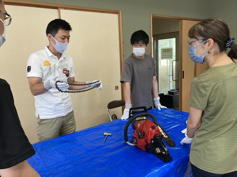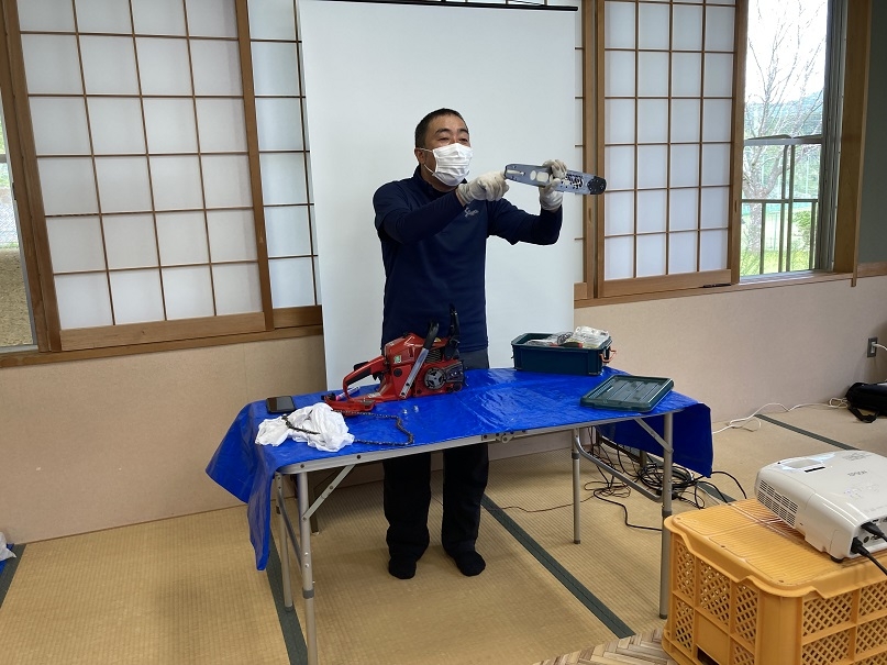 午前中は振動障害及びその防止に関する知識、関係法令について、午後はチェーンソーの点検及び整備について学びました。チェーンソーの点検・整備は4つの班に分かれて実際にチェーンソーを使って行いました。