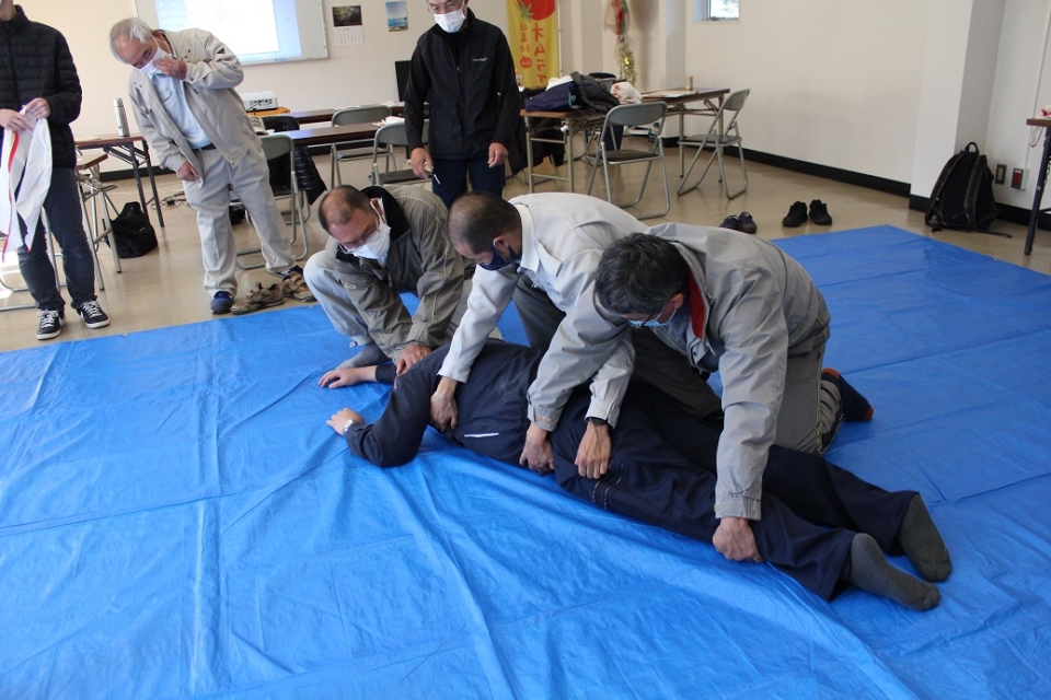 4回目の午前は仁淀消防組合にお願いして救急法について学びました。森林ボランティア活動で起こり得るケガ等の緊急時の対応や応急手当て等について質疑応答や実技を交えて教えていただきました。