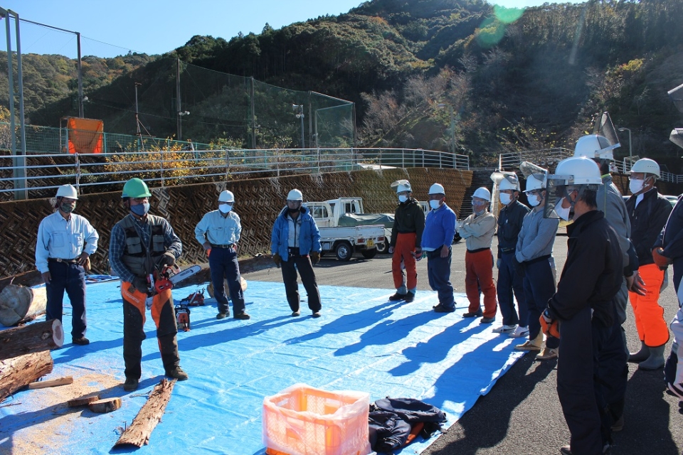 20代から60代までのこれから森林ボランティア活動に参加する意欲のある方やすでに活動を行っている方など15名が参加し、森林ボランティア活動を安全に行うために必要な森林整備の基礎知識やチェーンソーと刈払機の取り扱い、伐木等の方法について座学と実技を交えて学びました。