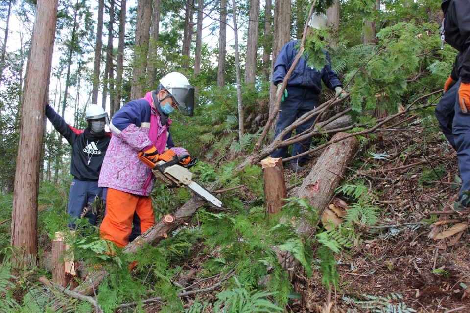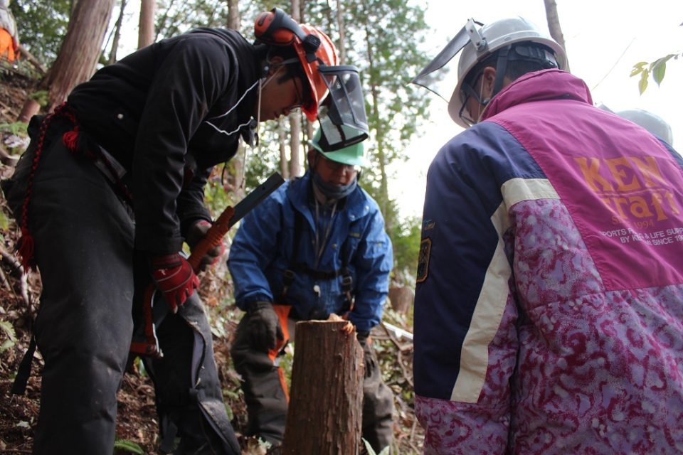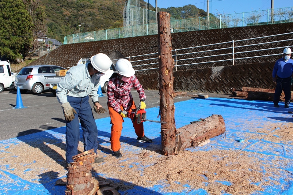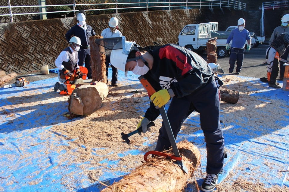 午後は、実際に丸太を使ってチェーンソーの操作、玉切りや伐倒方法(受け口・追い口)等の練習をしました。講師は、日高村を中心に活動するボランティア団体「木の駅ひだか」の片岡正法さん、松本弘昭さん、田鍋俊六さん、楠目耕一さんの4名です。