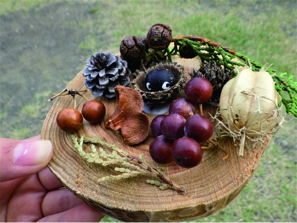 実施内容 | 木の実や落ち葉を使って工作する。工作をしながらさまざまな木の実や落ち葉の色や形を観察し、自然の造形の多様さを実感する。 |