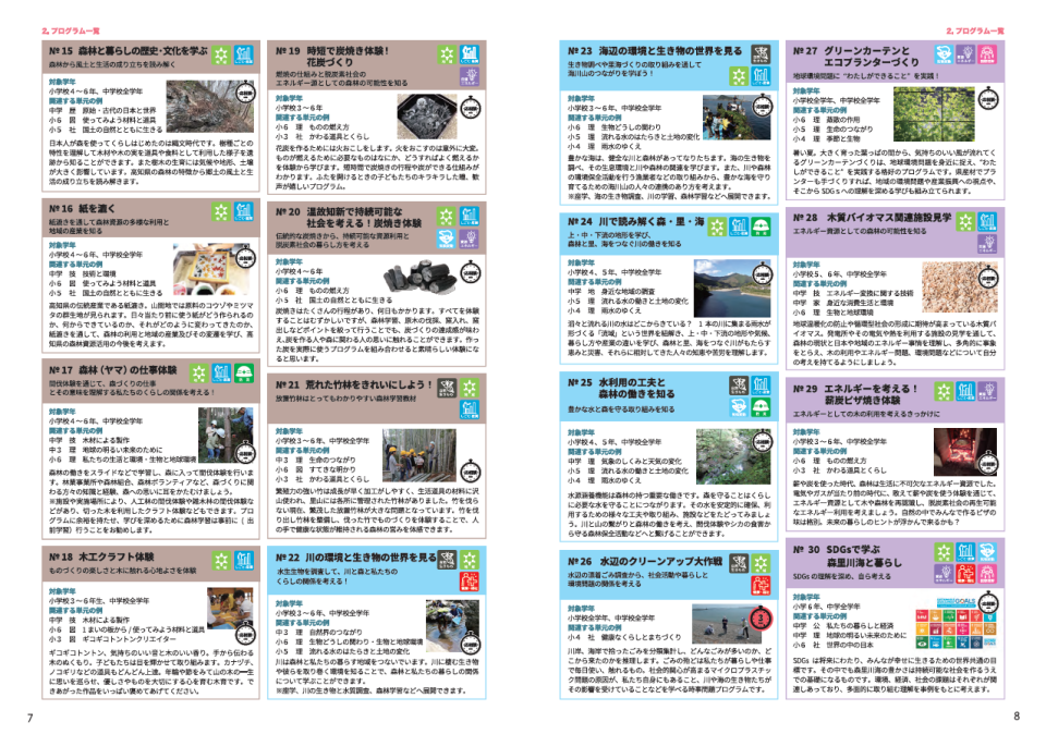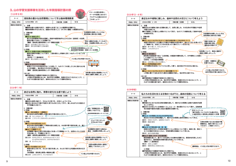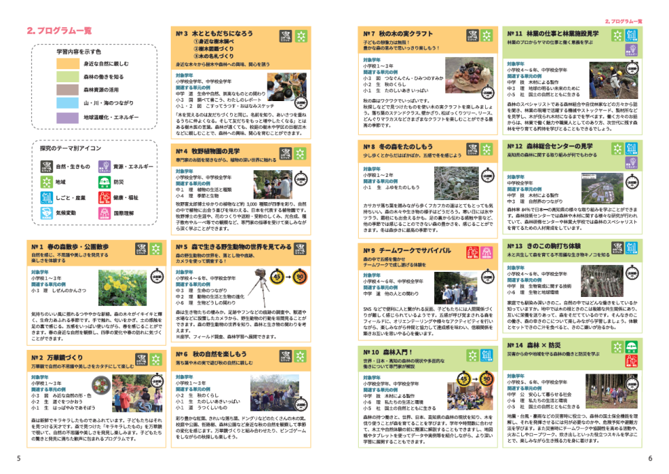 ハンドブック5~8ページでは、各プログラムの概要と関連する単元の例、探求テーマなどとの関連を示しています。多様な森林環境学習プログラムとの関連性の参考とし、年間を通じた学びのイメージを構想してください。