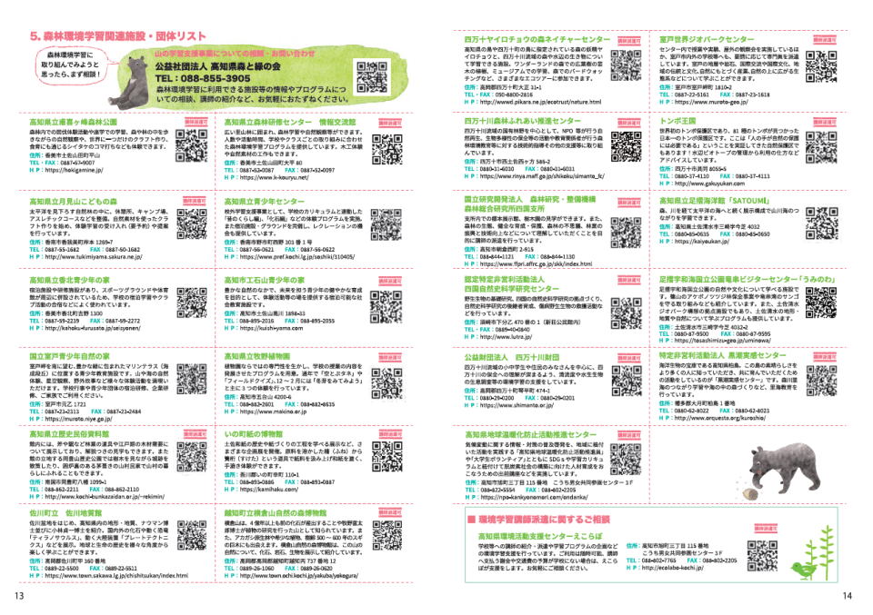 ハンドブック13~14ページでは、森林環境学習関連施設・団体を紹介しています。各施設や団体に関する情報は、「森林環境学習関連施設・団体一覧」のページをご覧ください。
