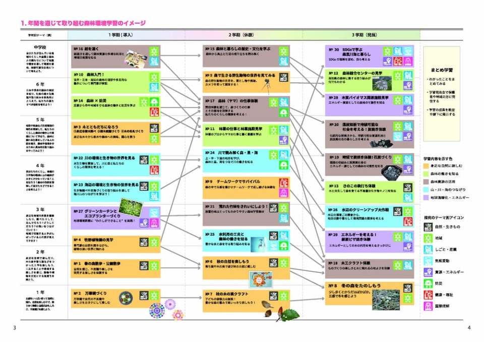 ハンドブック3~4ページで、さまざまな森林環境学習プログラムを組み合わせた「年間を通じた学習のフロー」を例示しています。