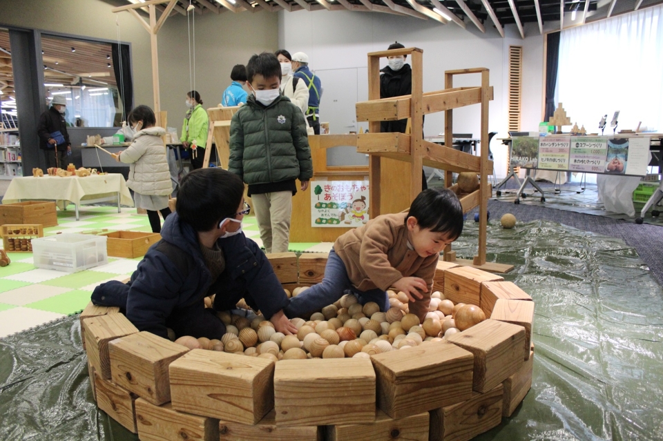 - 木のおもちゃ広場木の玉プールや木のおうちなど、たくさんの木のおもちゃで遊べます。