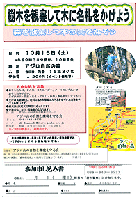 アジロ自然の森に群生する様々な樹木の名前を覚えて、名札をかけよう。森の中をたくさん歩いて、色んな木の実を探してみてね。君はいくつ見つけられるかな?