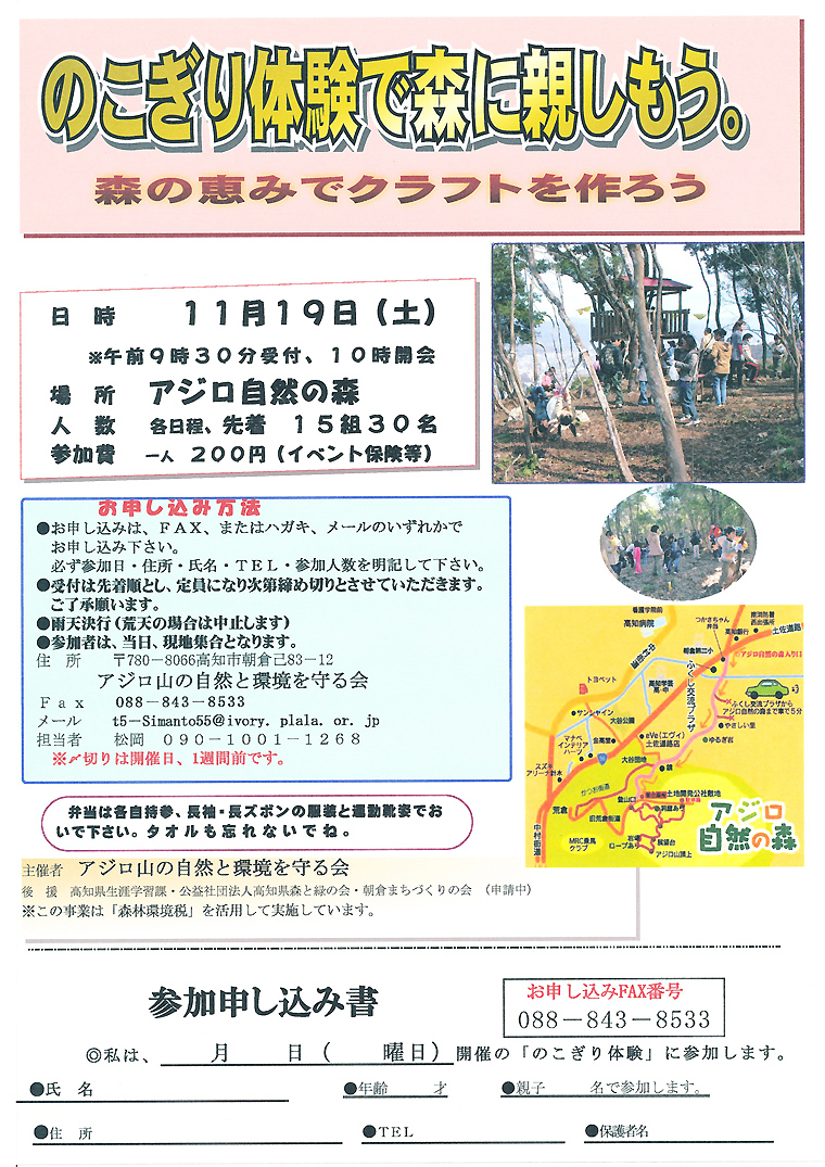 のこぎり体験とクラフト作り【終了いたしました】みんなで木を伐り、アジロ自然の森を綺麗にしよう。のこぎり体験後は、伐った木を使ってクラフト教室を開催します。 ●お問い合わせ・ご予約