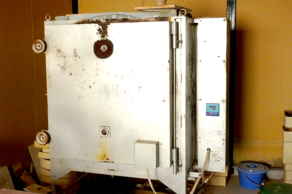 少し離れた部屋の中で、銀色をした大きな四角い窯が熱を発し、作品が焼かれます。