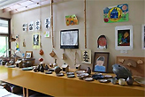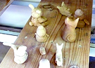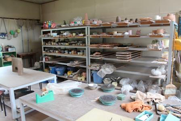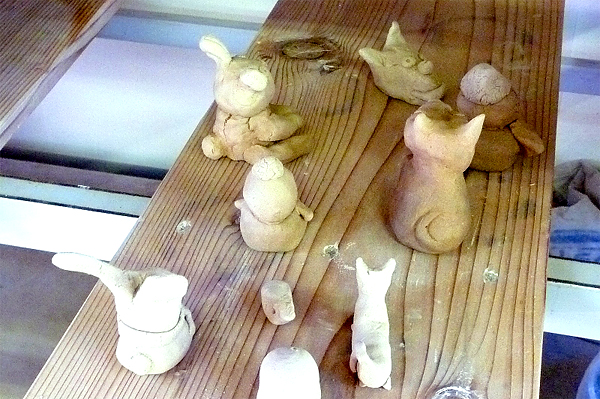 工房の中には思い思いの形に作られた作品がたくさん並んでいます。乾燥途中の物cや素焼きの物。子どもの作品らしい動物の姿も。実に様々です。