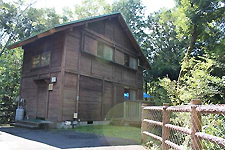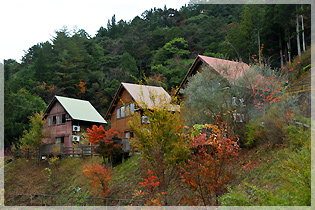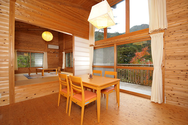 地元産の杉やヒノキを使った心地よい木の香りに包まれたコテージ、ヒノキ張りの床で50名収容できる研修館のほか、土のにおいのするテントでの一夜も格別です。早朝には、すがすがしい空気の中で野鳥の声を、夜には、満天の星空の中でムササビやフクロウの声を聞くことができます。ベランダから見える対岸の山々の景色も美しく、安らかなひとときを過ごすことができます。