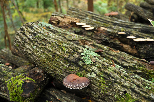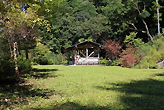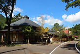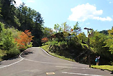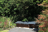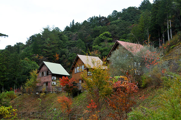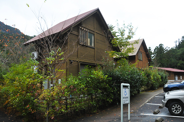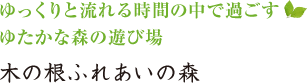 「木の根ふれあいの森」は、樹齢数百年の木々が立ち並ぶ自然林の中に建てられた野外施設です。標高600mの森の中に建てられているので、夏はとても涼しく、秋は素晴らしい紅葉を見ることができます。樹齢300年ほどの天然林の中には、よく整備された遊歩道があり、秋篠宮親王、悠仁さまのお印の木になった樹形のとても美しいコウヤマキ(高野槙)の巨木もあります。