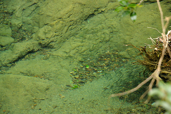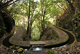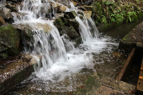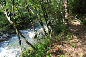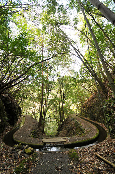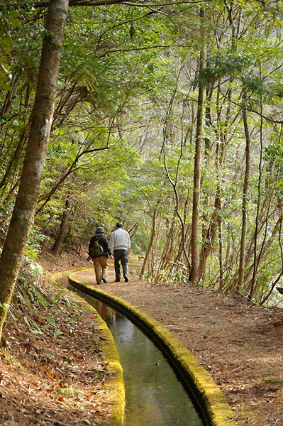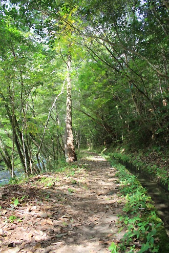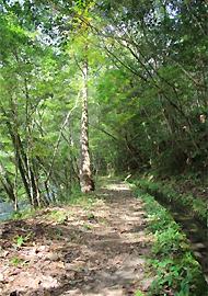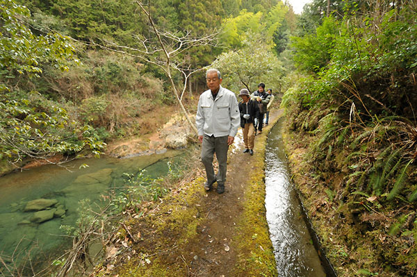 梼原町松原地区の「久保谷セラピーロード」には、県内外から多くの方が癒しの風景と時間を求めて歩きに来ています。このセラピーロードの特徴は、泳いでいる魚が見えるほど透明な久保谷川と、約90年前の昭和初期、水田へ水をひくための水路が山肌沿いに約3kmに渡って延びて(水田までの総延長は6km)、その水路に沿って歩いていく、水のコースなのです