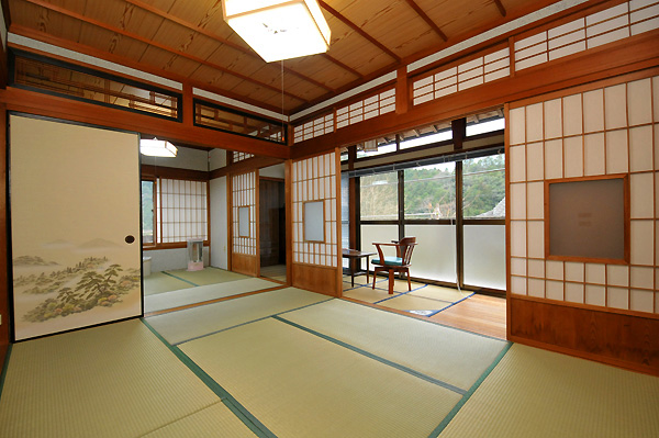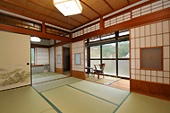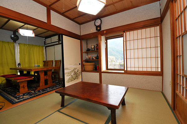 「山遊亭」は林野庁の廃止になった営林署の事務所跡を改装した松原の民宿です。セラピーロードが認定されたのをきっかけに、同地区長の下元さんご夫妻が、松原にたくさんの方が訪れてほしいという想いで、平成21年の6月にオープンしました。広いお部屋と長い廊下の木造平屋は、レトロで懐かしい昭和中期の佇まい。最大7名まで泊まれる広さも魅力です。