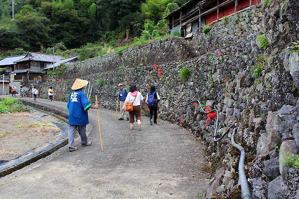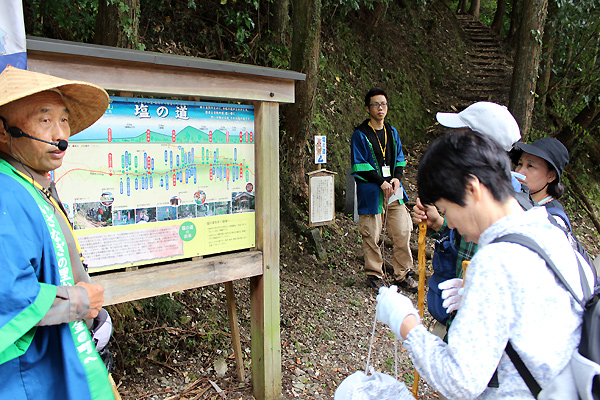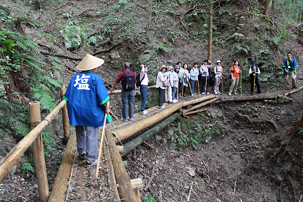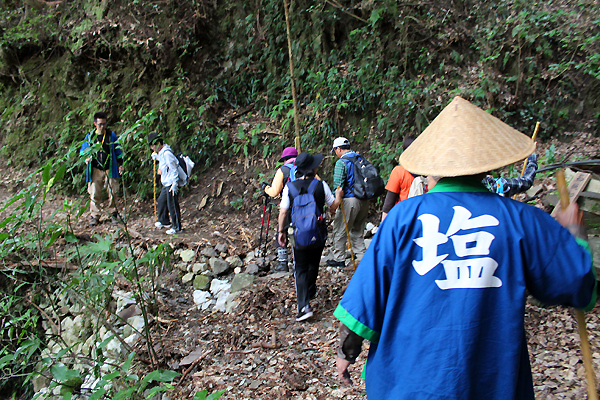 保存会会長と一緒に歩きながら行く塩の道。救護車も同行し長時間でも安心して歩く事が出来ます。距離が長い塩の道「朝から晩までのみち」約10時間コースから「源太のみち」約2時間30分のコースなど他16区間に別けられており、好きなコースを選んで歩く事も可能。大栃地区「朝の散歩みちコース」では保存会会長が小学生時代に通っていたという場所があり、当時を振り返りながらの案内に熱い思いがつのる公文会長。当時の塩の道の様子が鮮明に伝わって来ます。塩の道は「生活の道」で有り多くの人の歴史を刻んでいる事が伺えます。
