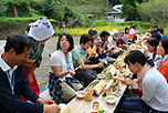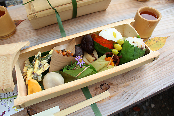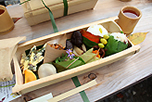 町内外の協力者も増え始め、仲間とともにでコツコツと道の整備を行っていた公文さん。「塩の道」は、平成16年、日本ウォーキング協会が選定する「歩きたくなる道500選」に選ばれ、復元活動はさらに軌道に乗り始めました。さらに、「塩の道」を地域おこしにつなげようと、地元の女性たちに声をかけてできたのが「おばやんの竹弁当」です。山菜など地元の食材を使い、器も地元に生えている竹や葉っぱがお皿代わり。「塩の道」にしかないオリジナルの弁当が誕生しました。さらに、休憩所の設置や「塩の道」の歴史や自然、昔話などの紹介をするガイドなど、気軽に訪れてもらえるような取り組みをがどんどん広がっていきました。