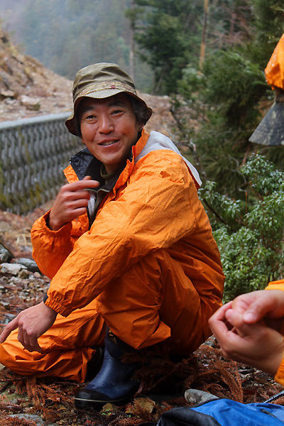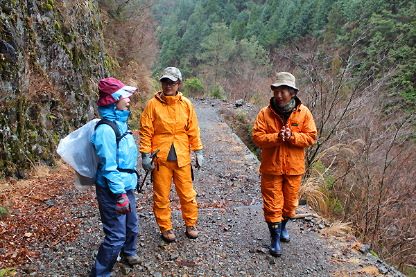 林道トレッキングへ向う途中、山道を走っていると急に車を停めて窓を開け「ほら、あそこに猿の群れがいるよ、ケッケッ!!」と声を出す岡林さん。川むこうに居る猿の群れから「キッキッキッ-!!」という声が「威嚇しゆうね~、あれはボス猿や」と。まったくどれがボス猿か分からない私達。猟師の目と鼻と耳を持っている岡林さん、私達には観えない物が山ではいっぱい観えている様です。自然の恵みを生かしきる技と自然の中へどっぷりつかる楽しみ方を教えてくれる岡林夫妻です。
