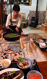 宿の料理は全てご主人の手作り。もちろん鹿やアメゴは幸弥さんが狩猟したもの。宿の庭に植えられているハーブや野菜なども活用し、囲炉裏を囲んでの鹿鍋、鹿の軟骨のスープ、鹿肉のソーセージなど和洋折衷織り交ぜた鹿肉の美味しい食べ方を提供してくれます。