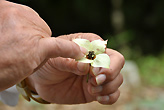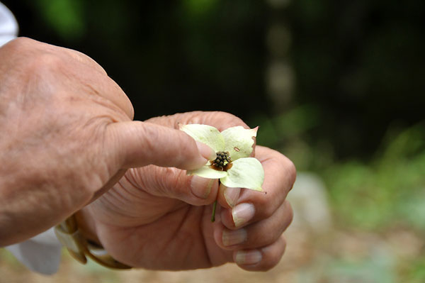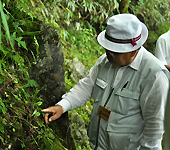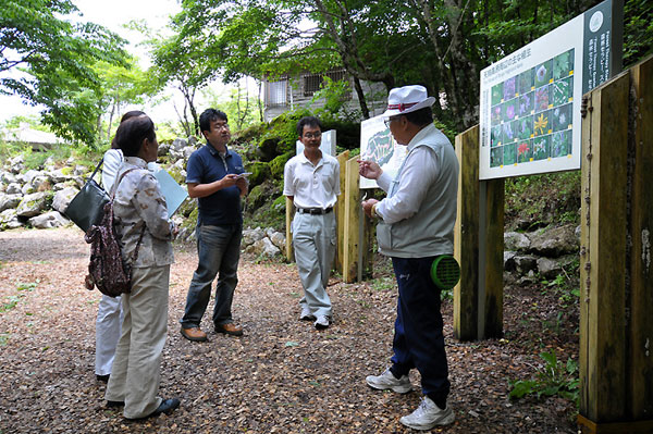 森林セラピーロードのガイドは、参加者の後ろを歩き、積極的に案内はしません。質問があれば答えるというスタイルです。この1kmという行程でも、多くの植物や昆虫、小鳥と出会います。ガイドがあれば、知識の幅はぐんと広がりま す。