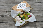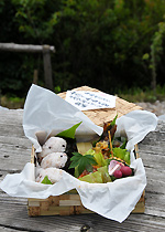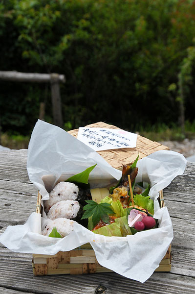 森林セラピーロードの出発点になる「天狗荘」では「セラピー弁当」を前日迄に予約すれば準備してくれます。丸太のベンチがある中間地点で食事をするのも楽しみの一つ。山菜など地の物がふんだんに使い、竹編みの器に入ったお弁当をどうぞ。
