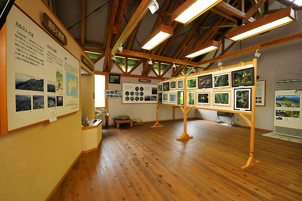 天狗荘に隣接しているのが「カルスト学習館」です。ここは四国カルストを知り一層の理解をしてもらう学習の場。展示室は四国カルストの生いたちをはじめ、天狗高原の昆虫たちや、森と草原の生き物などがあります。また研修会が出来るレクチャールームなどもあり、県内外からの利用者がいます。館長の山下敬俊さんはまさに天狗高原やセラピーロードのエキスパート。説明してもらえば、一層理解できそうです。