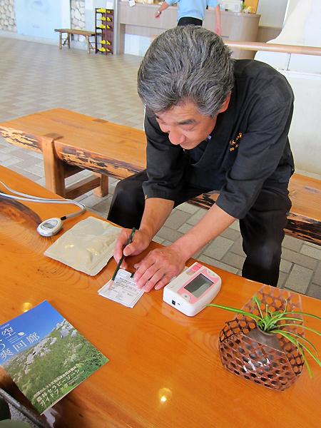 森林セラピーロードの出発点になる「天狗荘」では「セラピー弁当」(1,000円)を前日迄に予約すれば準備してくれます。丸太のベンチがある中間地点で食事をするのも楽しみの一つ。また出発前後でストレスチェック(一人300円)も出来るので、話題づくりにどうぞ。