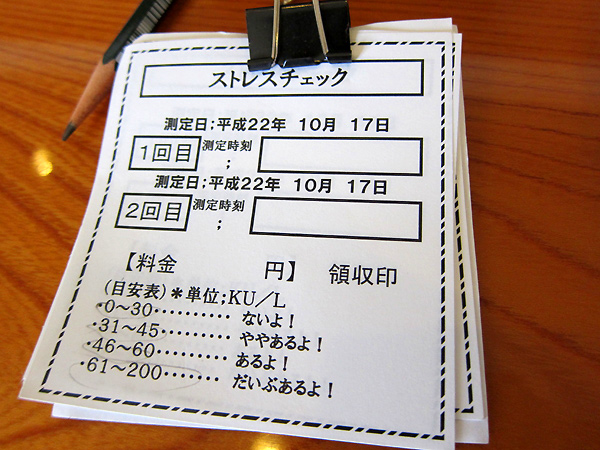 個人差も有りますが、何も考えずぼーっとゆっくり1時間程度セラピーロードを歩くのが身体に負担なくベストという事。頂上の天狗荘にてストレス度チェックを測定出来ます。セラピーロードを歩く前と後に測定。測定器は唾液のアミラーゼの分量を測定してストレス度を計るという物。唾液中に含まれる消化酵素のひとつの唾液アミラーゼ(唾液中のα-アミラーゼ)を非侵襲で簡単に測定できる分析装置です。 数値が高いとストレス度が高いということになります。セラピーロードを歩く前にお試しください。