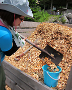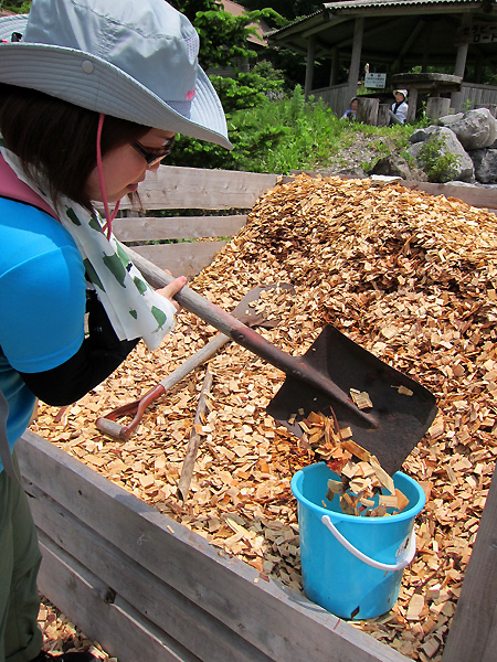 セラピーロードの入り口にあるヒノキチップをバケツに入れて自分の好きな場所に敷く事が出来きます。 ヒノキの香りとともに森林浴を楽しめ、更に癒しの効果を体感。