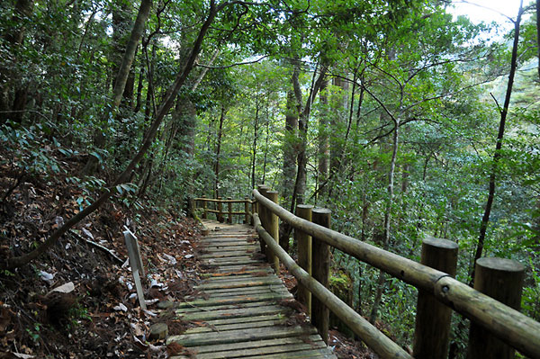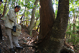 千本山登山口の入り口には、立派な木製の吊り橋があり、それを渡ると林野庁が全国の国有林から選定した「森の巨人たち百選」のひとつ、「千本山・橋の大杉」が出迎えてくれます。そこから木製の階段や桟道を進んでいきますが、まるで巨木の間をぬって登っていく感じです。清岡さんは途中で足を止め「ここの魅力は、木の上から下までしっかりと観察できることです。あの一帯は多分杉が台風かなにかで倒れたので、日が入るようになり、下草がぐんと生えて来たことがわかりますよね」といいます。確かに巨木の場合、下から見上げることはあっても、その中間から上と下の両方を眺めることはできません。また、この千本山保護林は間伐も、倒れた木もそのまま。人の手を入れないので、植物の力関係や、生存するための競争が感じられます。