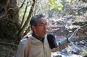 清岡さんは所々足を止めて、この場所は高木のスギと低木のサカキが多い特徴があるとか、新旧相ゆずるという縁起を祝って新年の飾り物に使うユズリハの話、深い山にある森のにおいなど、ポイントごとにガイドしてくれます。