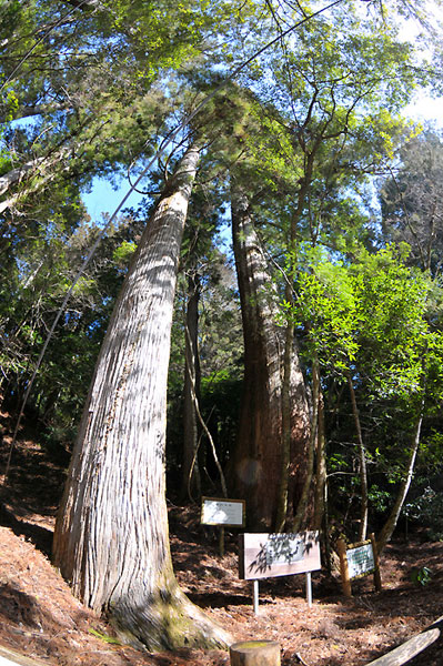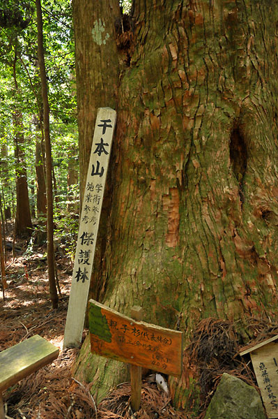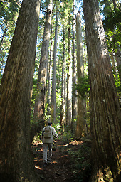 天然の巨大なスギが並ぶ千本山は