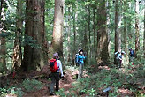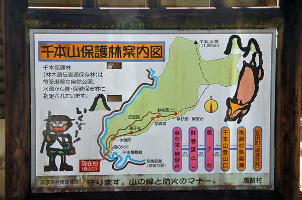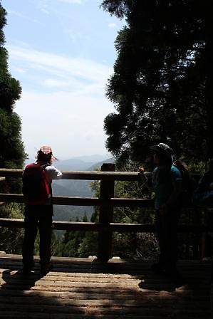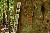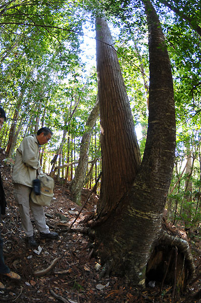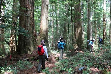 気持ちの良い話をしているうちに、直径1mから2m、高さ50mのスギの巨木の横をすり抜け、親子スギや写真場、鉢巻落とし、傘杉堂、展望台まで来ました。美しい花畑や素晴らしい頂上からの眺めがあるわけではありませんが、自分の生き方に向き合い明日への元気を与えてもらえる千本山でした。まさに山の霊魂と神秘さを体験できる千本山保護林と言えるでしょう。